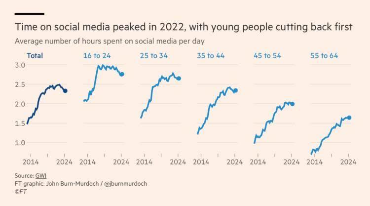 📊 Відчутне скорочення. Наприкінці 2024 року дорослі (віком від 16 років) у розвинених країнах проводили в середньому 2 години 20 хвилин на день у соціальних мережах — це майже на 10% менше, ніж у 2022 році.